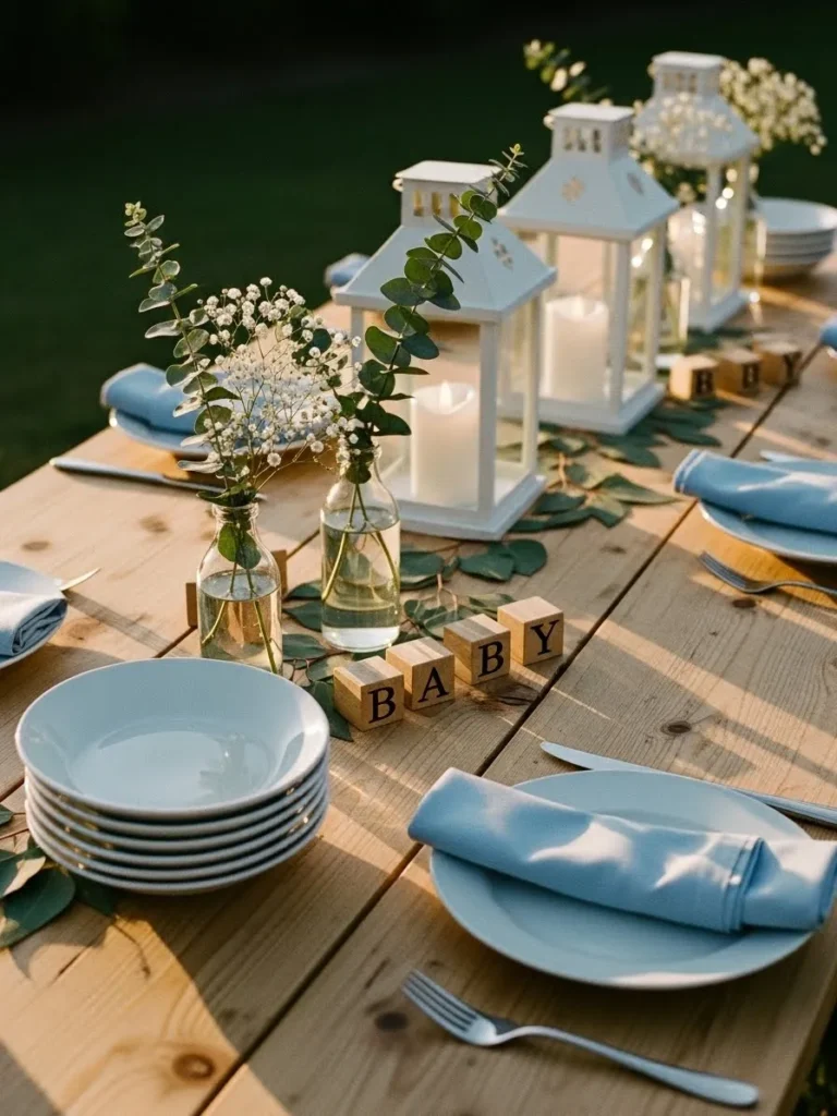 This setup feels like the sweetest little outdoor moment with its natural wood table, soft blue tableware, and simple greenery woven right down the center. White lanterns with candles add a cozy glow while clear glass bottles hold delicate baby’s breath and eucalyptus for that effortless, airy look. The light blue napkins neatly rolled on crisp white plates keep everything calm and cohesive without feeling overdone. Wooden letter blocks spelling baby bring just enough charm and playfulness without stealing the spotlight from the overall design.
