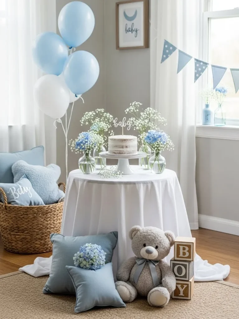 This setup centers around a simple round table dressed in crisp white fabric and topped with the sweetest soft blue accents. A petite cake sits on a classic stand, surrounded by clear glass vases filled with delicate white florals and pale blue blooms. Light blue and white balloons float nearby, adding height without overpowering the space. Cozy floor pillows, a plush teddy bear, and wooden letter blocks spelling BOY create a relaxed, homey feel that blends perfectly with the neutral room and natural light coming through the windows. Everything feels intentional but effortless, like it was styled slowly with love instead of rushed together.