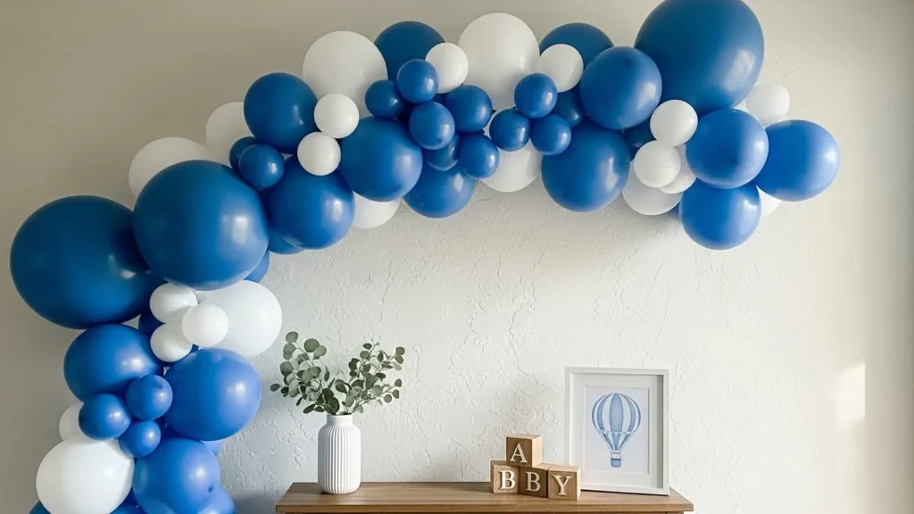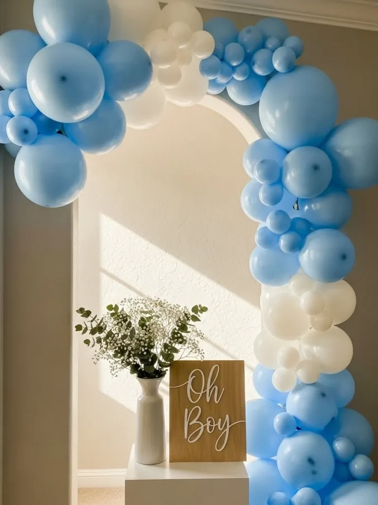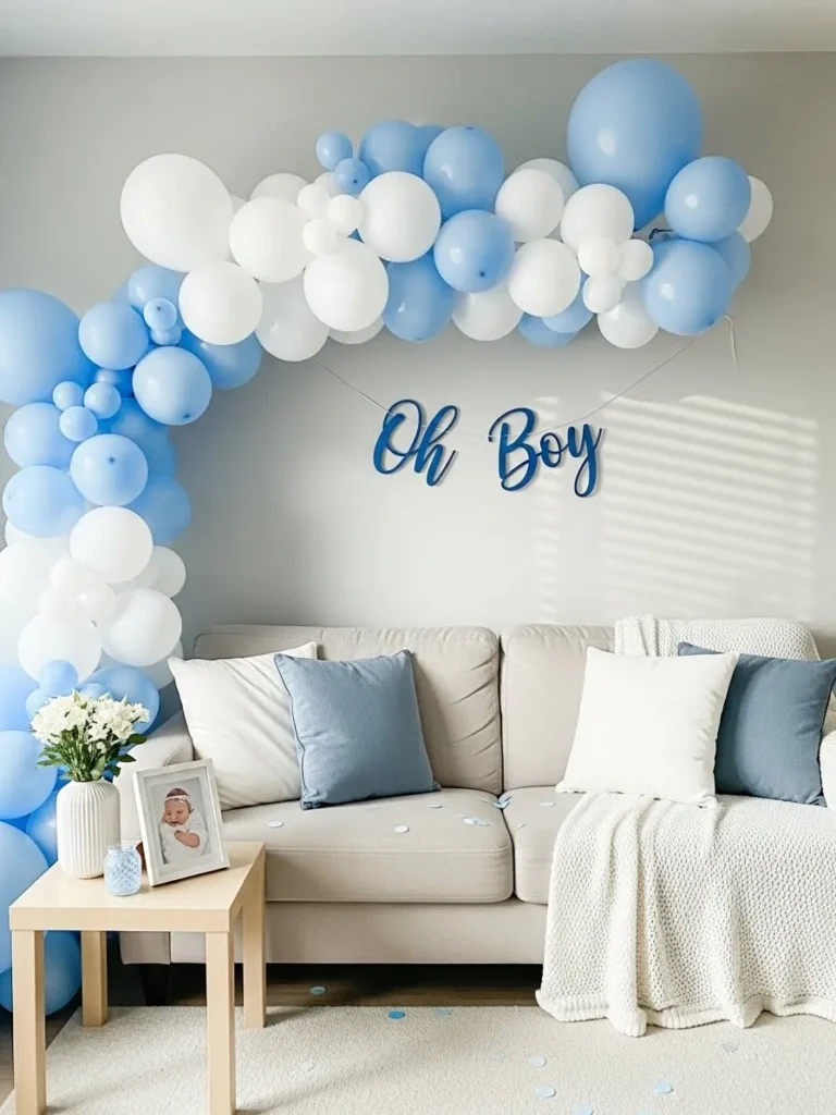 This living room setup keeps things light and sweet with a soft blue and white balloon arch that frames the space without taking it over. The balloons vary in size which gives the whole display a relaxed and slightly whimsical look instead of feeling too staged. The neutral sofa and cozy throw balance the playful decor beautifully while blue accent pillows tie everything together. I also love how the simple Oh Boy sign becomes the focal point without feeling loud or over the top. It all feels airy calm and very easy to recreate at home.