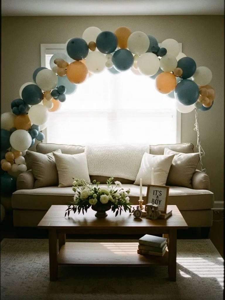 This setup features a soft neutral living room styled with a plush sofa, layered throw pillows, and a simple wooden coffee table that keeps the space feeling warm and lived in. The balloon arch steals the show with its mix of muted blue, creamy white, and warm beige tones, gently framing the window without overwhelming the room. Natural light pours in and highlights the cozy textures, from the upholstered seating to the fresh floral arrangement on the table. Small details like the candle, books, and subtle boy themed sign add charm while still keeping everything clean and uncluttered.