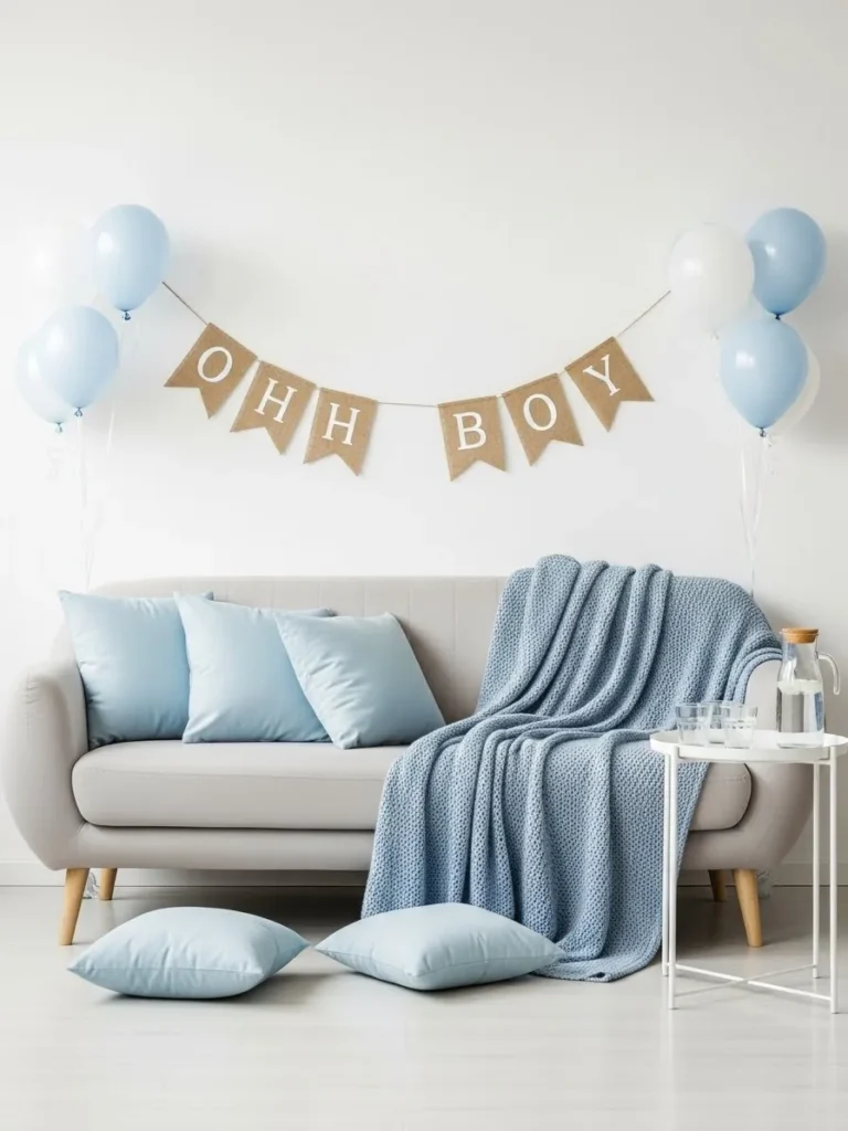 This setup features a calm neutral sofa styled with soft blue cushions and a cozy knitted throw that instantly feels welcoming and relaxed. Light blue and white balloons frame the space without overpowering it, while a simple kraft paper banner adds that sweet boy baby shower hint without screaming theme party. The clean white walls and uncluttered layout keep everything airy and modern, and the small side table with glassware makes the whole space feel thoughtfully put together yet totally livable.