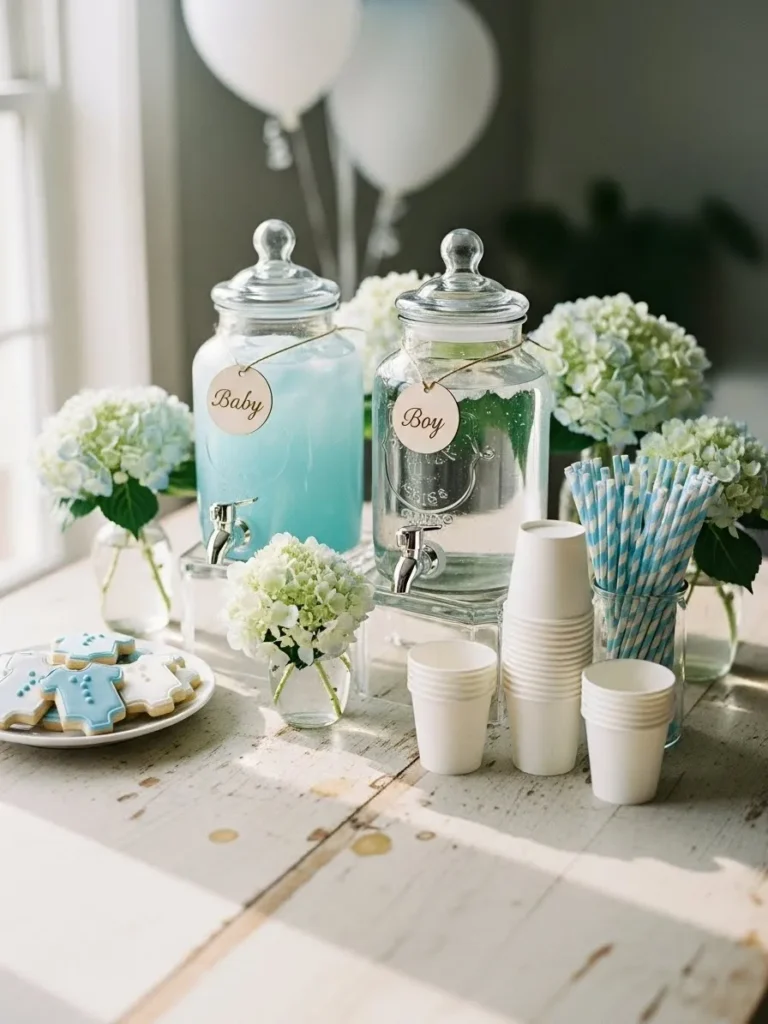 This setup features a simple drink station styled in soft blue tones that instantly feels calm and welcoming. Clear glass drink dispensers filled with pale blue lemonade sit neatly on a light runner, paired with matching paper cups and a small handwritten sign that adds a sweet personal touch. The pale blue balloons in the background and the tiny floral accents keep everything light and airy without feeling overdone. It feels tidy, intentional, and very easy to recreate at home using items you might already have or can find quickly.