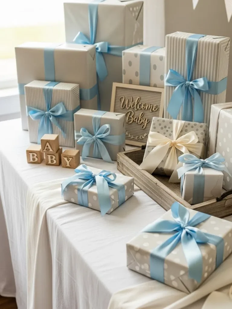 This setup features a beautifully layered gift table dressed in soft blues, creamy whites, and subtle patterns that feel calm and intentional. Wrapped presents in coordinating paper are stacked at different heights to add visual interest without looking busy. Satin ribbons in baby blue keep everything cohesive, while small details like wooden baby blocks, a neutral welcome sign, and a rustic tray add warmth and charm. The overall look feels tidy and curated, yet still relaxed and approachable, which is exactly what you want for a simple boy baby shower.
