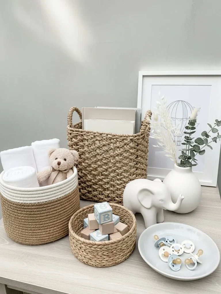The mix of practical baby items and decorative pieces feels intentional and cozy, from the plush teddy tucked into a rope basket to the simple wooden blocks and pacifiers styled on neutral trays.