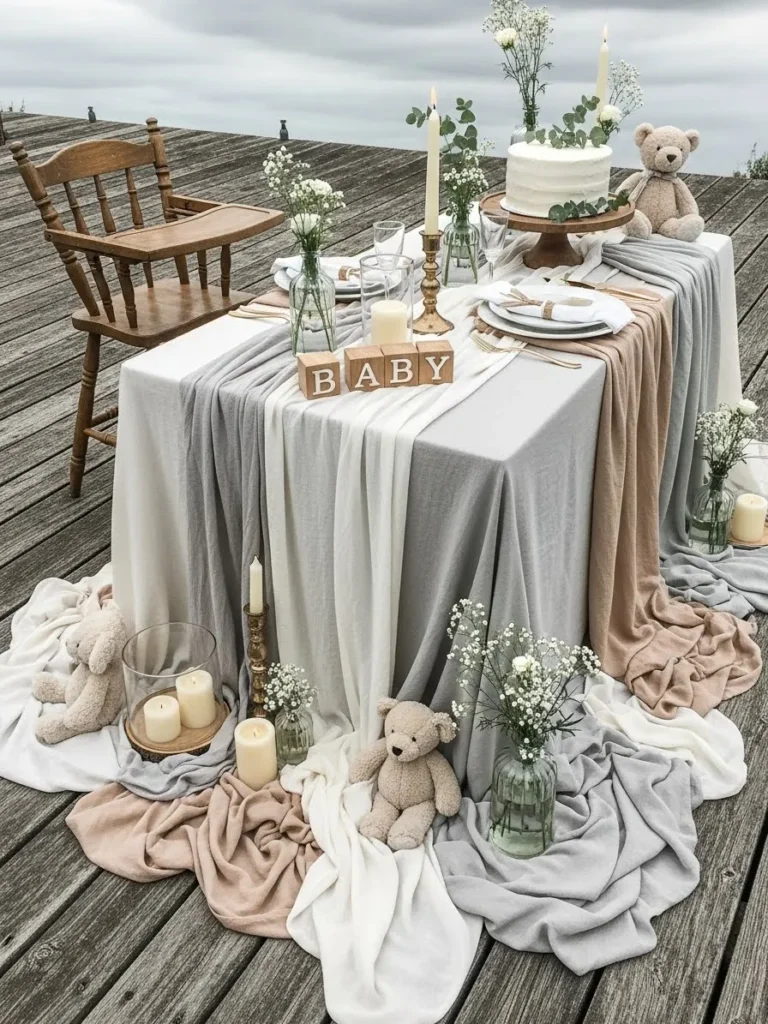 This setup feels like a breath of fresh air with its layered neutral linens flowing softly over the table in shades of cream, warm taupe, and gentle gray. The textures do all the work here, from the relaxed fabric draping to the simple wooden accents and glass vases filled with delicate white florals. Sweet teddy bears tucked around the table add a cozy, baby-friendly touch without tipping into anything too theme-y. Candles, soft place settings, and a simple cake display keep the look elegant and calm, while the outdoor setting gives everything an effortless, natural vibe.