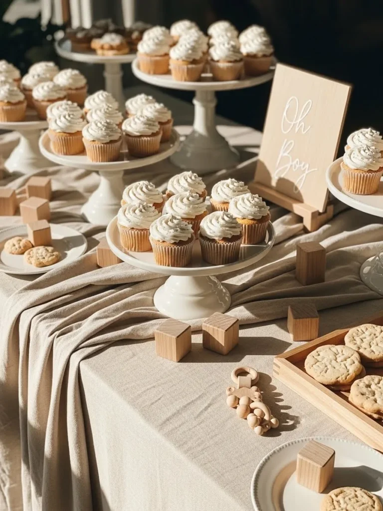 I honestly love this kind of setup because it feels so soothing to look at. It has that calm Pinterest energy that makes you want to linger by the table just a bit longer. The mix of sweet treats and natural textures feels timeless and gentle, which is perfect for a boy baby shower that wants charm without the noise. It is simple, warm, and quietly beautiful in that way that never goes out of style.