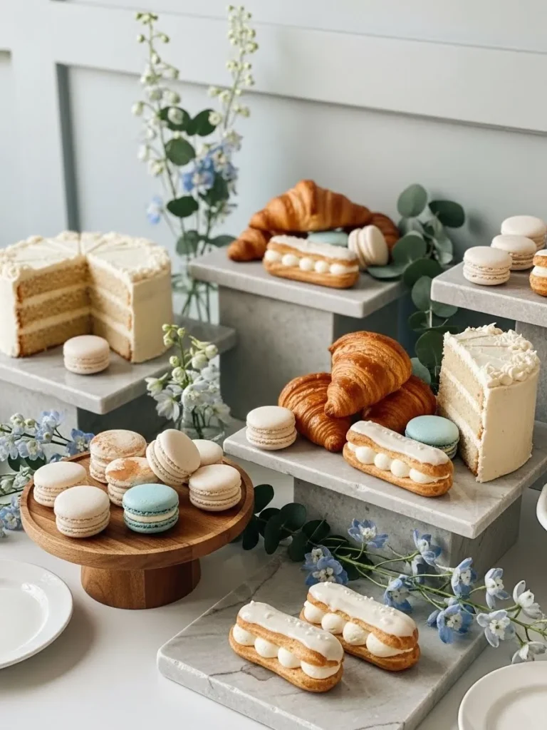 This setup feels like a sweet little Parisian bakery moment brought right into the home, and I am honestly obsessed with how calm and polished it looks. The neutral color palette sticks to creamy whites, soft beiges, and gentle hints of dusty blue that feel perfect for a boy baby shower without leaning too theme heavy. The tiered stone stands add height and structure while still feeling light and airy, and the mix of macarons, croissants, eclairs, and frosted cake slices keeps the table interesting without feeling cluttered. I also love the greenery tucked between the desserts because it softens everything and adds that fresh, styled but not overdone look.