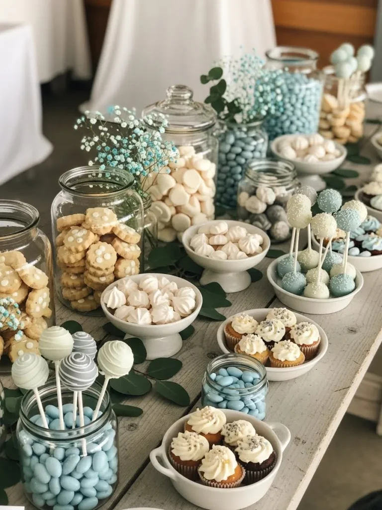 This setup feels like a dreamy mix of soft blue and creamy neutrals that instantly reads calm and inviting. Glass jars filled with cookies, meringues, and pastel candies are layered at different heights, which makes the table feel full without looking cluttered. The pale blue cake pops and frosted cupcakes add just enough color to keep things interesting, while the natural wood table and simple white serving dishes keep everything grounded and relaxed. It is the kind of styling that looks thoughtful but not overly styled, which is perfect for a baby shower that wants to feel cozy and chic at the same time.