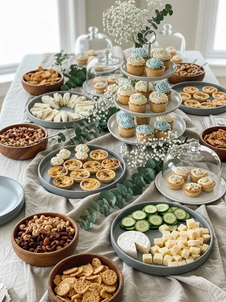 This setup feels like the kind of baby shower table you want to slowly walk around twice just to admire everything. Soft linen tablecloths set the base, layered with muted stoneware plates, warm wooden bowls, and delicate glass cloches. The color palette stays calm and cozy with creams, beiges, pale blues, and gentle greenery woven through the table. Simple cupcakes with soft blue frosting sit on a tiered stand as a quiet focal point, surrounded by bite sized tarts, crackers, cheese cubes, and fresh cucumber slices. Nothing feels crowded or over styled, which makes the whole table feel relaxed and welcoming.