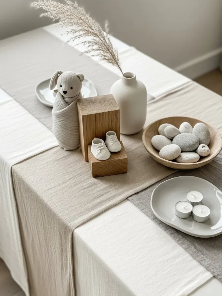 This table setup feels so calm and thoughtfully styled with its mix of soft fabrics, light wood, and gentle neutral tones. The layered table linens in warm beige and creamy white create a cozy base, while simple decor pieces like the wooden blocks, smooth pebbles, and ceramic dishes keep everything feeling intentional but never fussy. I love how the small details like the tiny baby shoes and the wrapped teddy add a sweet baby shower touch without overpowering the look. The dried pampas grass brings in height and texture, giving the table an airy and relaxed feel that works beautifully for a soft neutral boy baby shower.