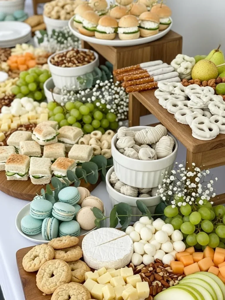 I honestly love this idea because it feels welcoming without trying too hard. I am always drawn to setups that look pretty but also feel practical, and this one nails both. Guests can help themselves easily, and the whole table still looks Pinterest perfect from every angle. It has that relaxed elegance that makes a baby shower feel special while still staying soft, neutral, and totally boy friendly.