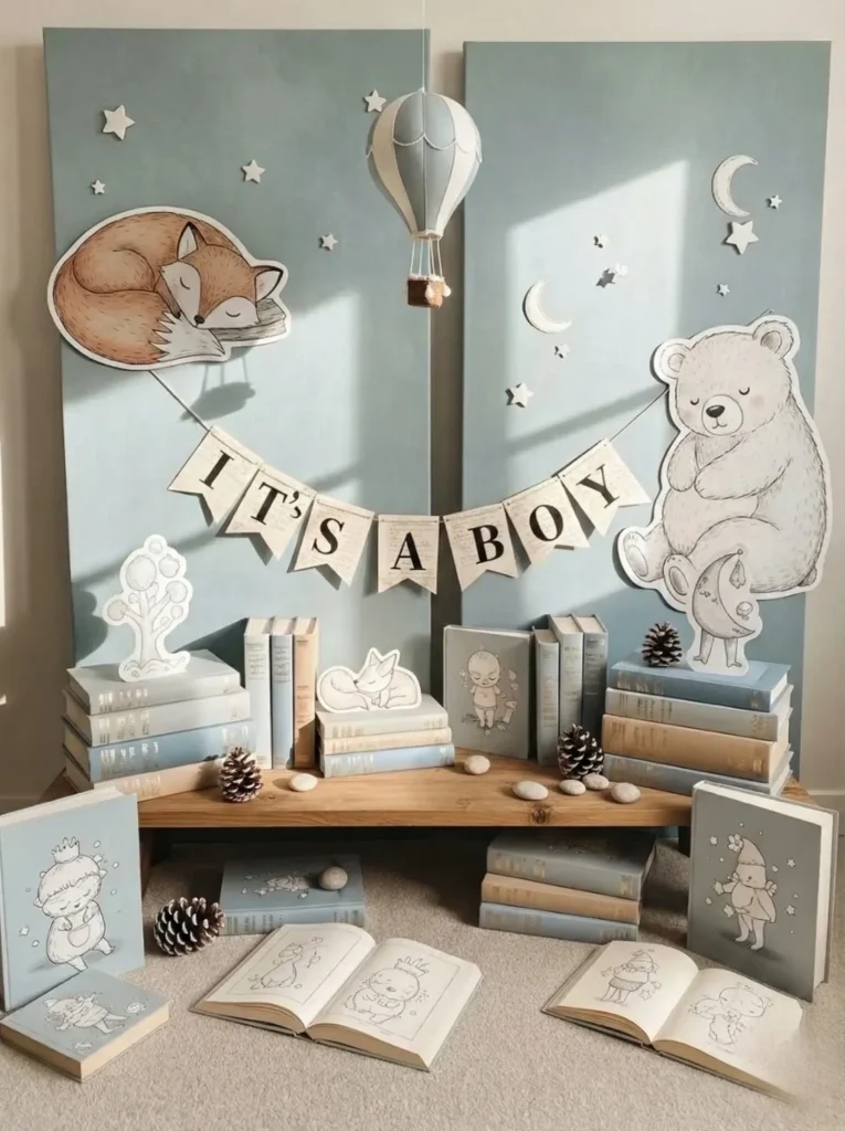 This sweet setup leans into a soft blue storybook vibe that feels calm, cozy, and perfectly baby boy friendly. Muted dusty blue panels set the scene, layered with hand illustrated woodland animals like a sleepy fox and a cuddly bear that instantly feel nostalgic and gentle. Little details make it extra charming, from the floating hot air balloon to the tiny stars and moon scattered across the backdrop. Stacked vintage style books, pinecones, and open story pages bring in a cozy nursery feel, while the simple Its a Boy banner ties everything together without overpowering the design.