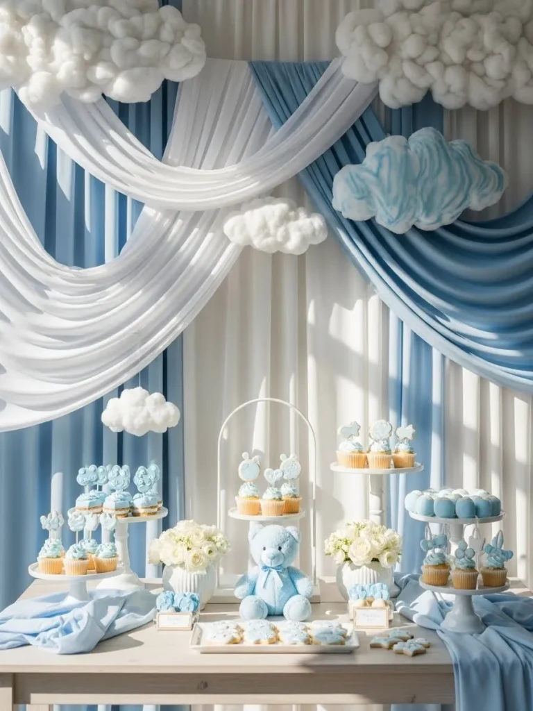 This setup feels like a dreamy little sky scene brought indoors, with flowing white and dusty blue fabrics layered into gentle swags across the backdrop. The soft cloud accents floating overhead instantly set a calm and whimsical mood, while the neutral table and classic dessert stands keep everything feeling clean and modern. Pale blue cupcakes, teddy bear details, and simple white florals add just enough sweetness without going over the top. It all feels light, airy, and perfectly balanced, which makes the whole space look styled but still cozy and welcoming.