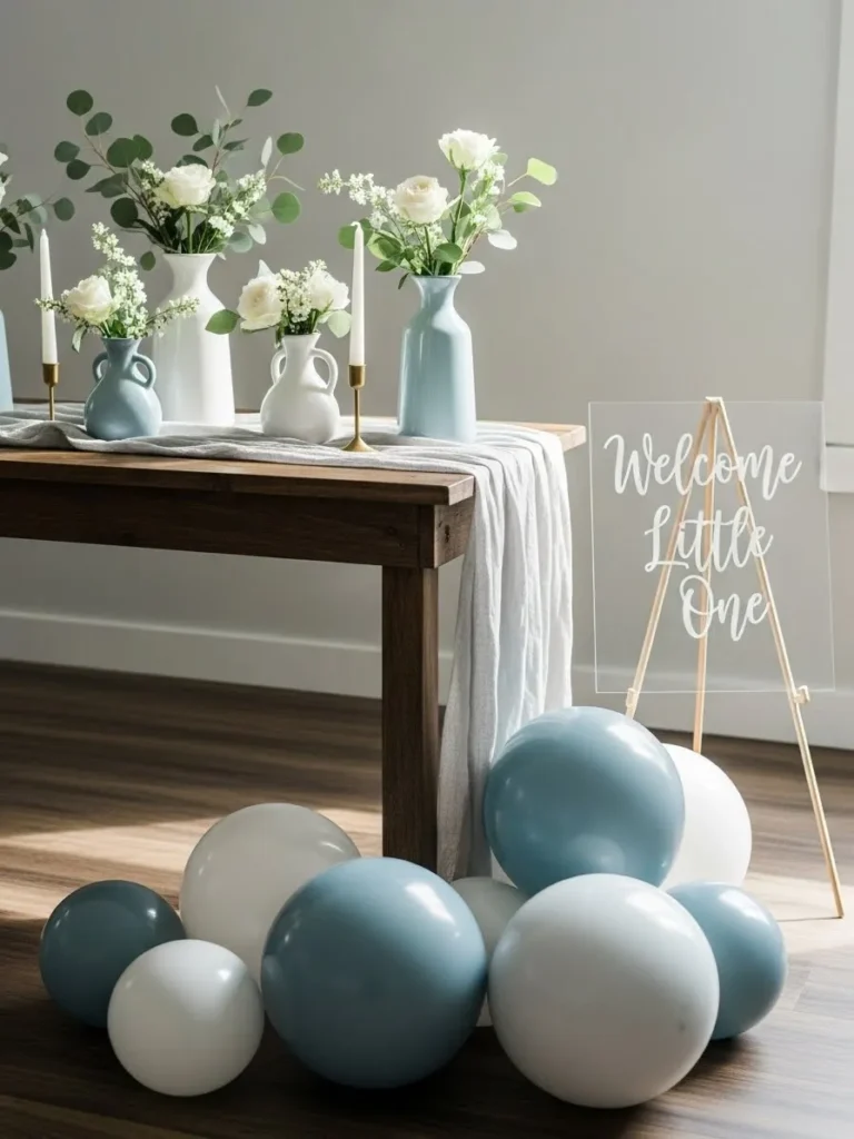 This setup feels calm and thoughtfully styled with a soft blue and white color palette that instantly reads modern and cozy. The wooden table keeps things grounded and natural while simple ceramic vases filled with white florals add a gentle decorative touch. I love how the balloon cluster stays low and relaxed instead of floating everywhere which makes the space feel intentional and uncluttered. The clear welcome sign leans into that airy look and keeps the focus on the details without overpowering the room.