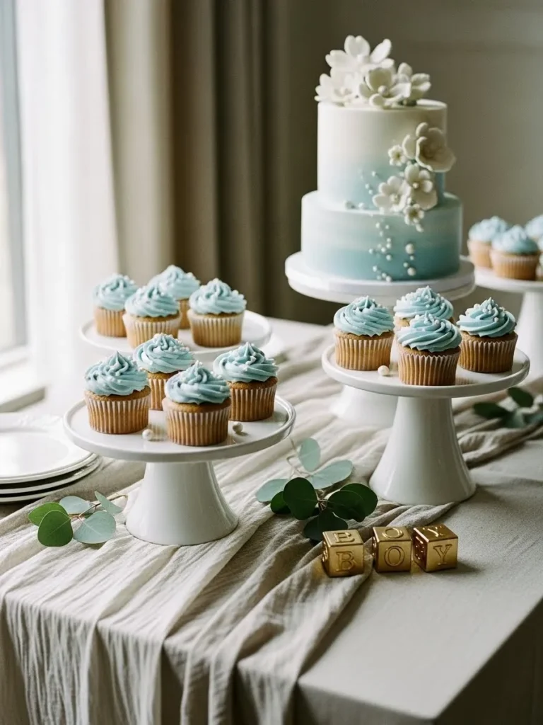 This setup leans into a calm and polished look with soft blue tones, creamy whites, and just a hint of greenery for balance. The tiered cake features a subtle ombré effect with delicate floral detailing that feels refined but still totally baby shower appropriate. Matching cupcakes sit on simple white stands, keeping the table cohesive and uncluttered. The neutral table linens and natural light give everything an airy feel that feels modern, gentle, and very Instagram ready without trying too hard.