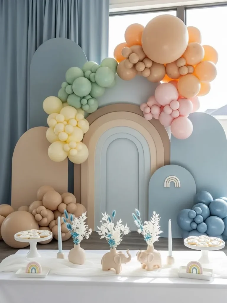 This setup leans into soft arches and layered curves that feel playful but still very polished. The muted pastel palette mixes dusty blue, warm beige, blush peach, and buttery yellow in a way that feels calm and modern instead of overly themed. The balloon clusters are organic and cloud like, wrapping around the arched backdrop for a cozy sculptural look. I also love how the clean white table keeps everything grounded while the small details like elephant vases, subtle rainbow accents, and simple candle holders add charm without visual clutter.