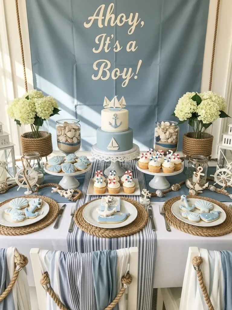 This setup leans into a soft nautical vibe with calm blues creamy whites and natural textures that feel fresh and modern without trying too hard. The table is layered with striped runners rope placemats and simple white dishware that lets the details shine. Sailboats anchors shells and subtle coastal accents are sprinkled throughout in a way that feels styled but still relaxed. The cake and sweets keep the palette cohesive with dusty blue icing and playful maritime shapes that look polished yet approachable. Everything feels balanced and airy which makes the whole table feel welcoming rather than overly themed.