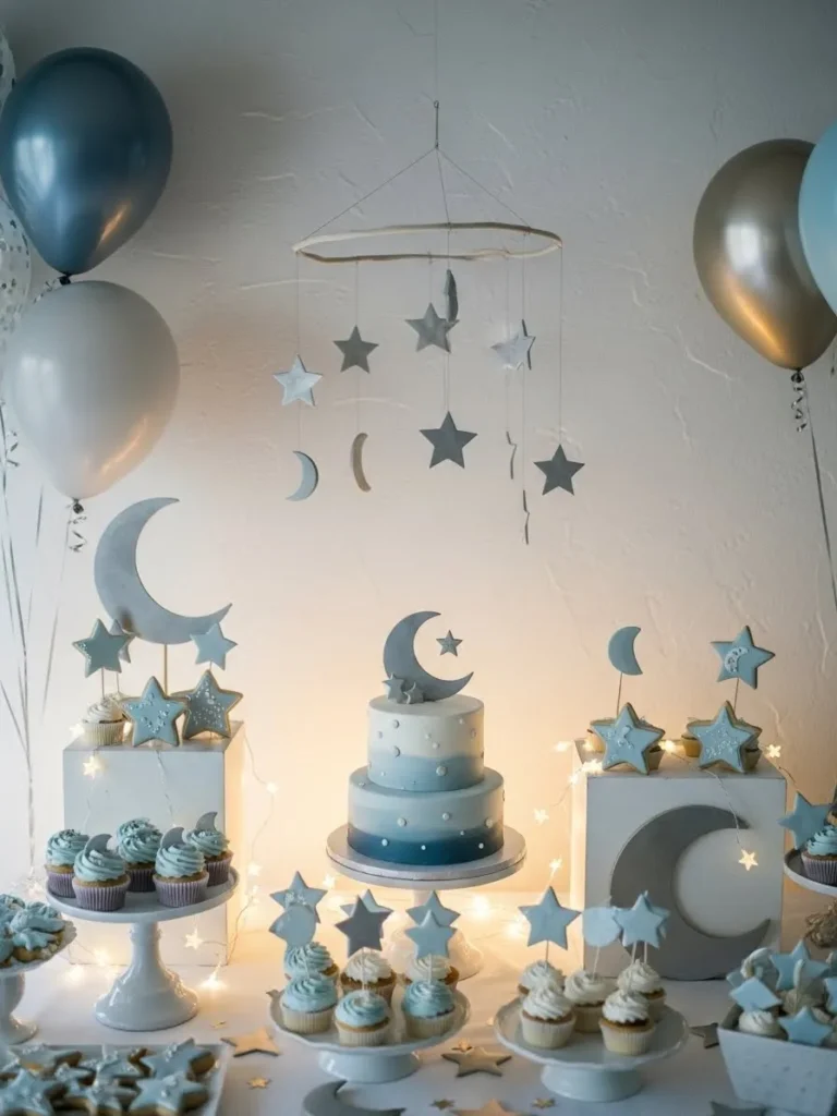 This setup leans into a calm celestial theme with soft blue tones, gentle neutrals, and just enough sparkle to feel special without going over the top. The layered dessert stands, star topped cupcakes, and moon details create a dreamy nighttime vibe that still feels light and modern. I love how the hanging mobile adds height and softness above the table while the mix of matte and metallic balloons keeps everything visually balanced. The palette stays cohesive with dusty blue, warm white, and subtle gold accents, which makes the whole display feel intentional and polished rather than overly themed.