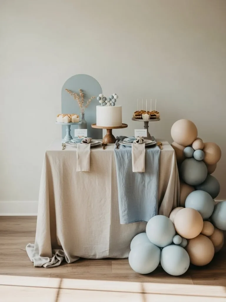 This setup feels calm and curated with its soft blue and warm beige color palette that instantly reads modern and cozy. The linen tablecloth adds an effortless texture while the simple cake stands and neutral ceramics keep everything looking clean and intentional. I love how the balloon arrangement flows naturally from the floor up the side of the table because it feels playful without being over the top. The mix of rounded shapes, muted tones, and minimal decor gives the whole space that fresh Pinterest worthy look that feels current but still timeless.