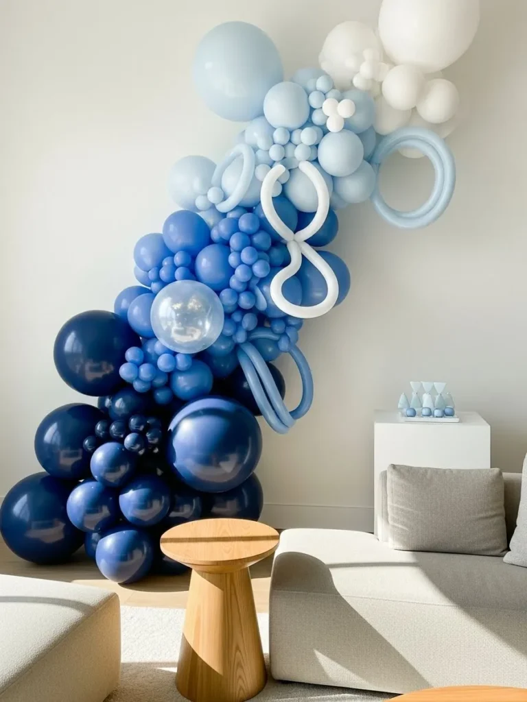 This setup leans into a modern living room backdrop with a sculptural balloon installation that flows from soft icy blue into deeper navy tones. The balloons are layered in different sizes which gives the whole display a really organic cloud like feel instead of looking stiff or overly styled. Paired with neutral sofas clean lines and light wood accents the blue palette feels fresh calm and very intentional. The overall look is airy but still grounded which makes it perfect for a boy baby shower that feels current and not overly themed.