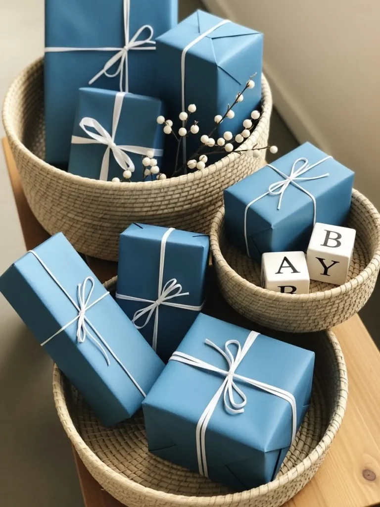 This setup leans into a calm and modern baby shower look with soft blue gift boxes neatly wrapped in crisp white ribbon and tucked into woven baskets. The color palette feels gentle and intentional with muted blues paired with warm natural textures like wicker and light wood. Everything looks thoughtfully arranged but not overly styled which gives it that effortless modern vibe. The mix of box shapes adds visual interest while keeping the overall look clean and cohesive. It feels minimal without feeling cold which is exactly what makes it so appealing.