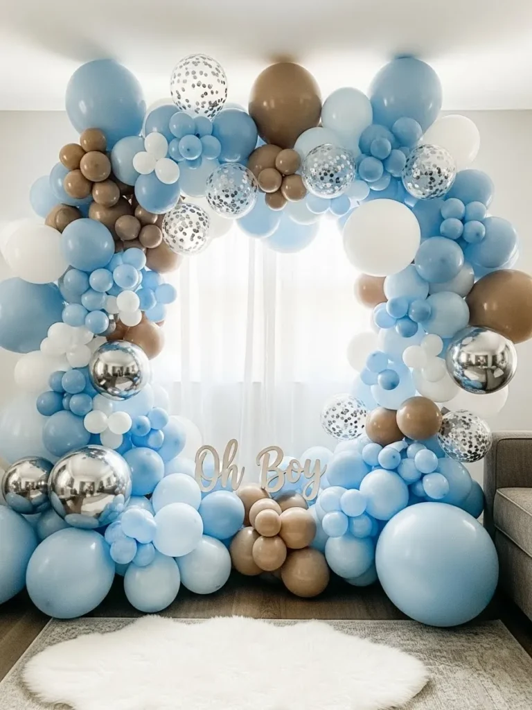 This backdrop features a full balloon arch built with soft blue tones mixed with warm beige and creamy white. The balloons vary in size which gives the whole setup a layered and cloud like look. Clear balloons with subtle confetti add a playful sparkle without feeling loud. The arch frames the space beautifully and creates a cozy photo moment right in the living room. A simple Oh Boy sign tucked in the center keeps the focus sweet and celebratory while still feeling stylish and home friendly.