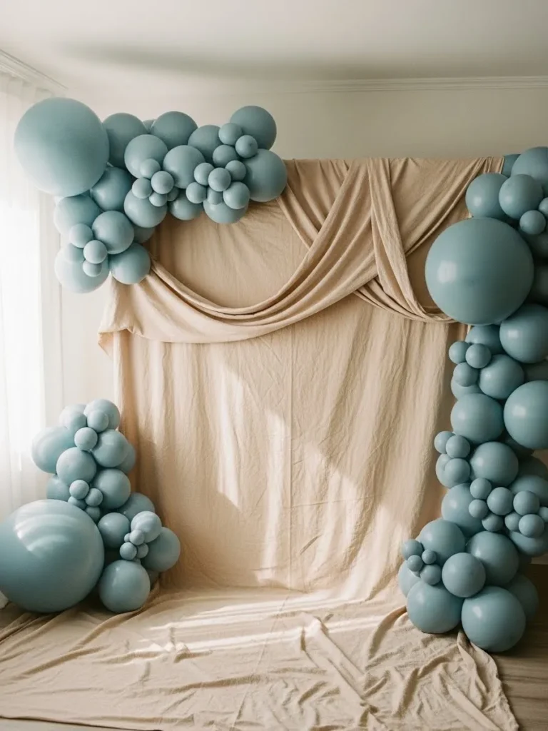 This backdrop pairs soft blue balloon clusters with relaxed beige fabric draping for a look that feels calm, cozy, and beautifully styled without trying too hard. The balloons vary in size which adds depth and keeps everything from feeling flat or overly perfect. I love how the neutral fabric softens the overall look and balances out the cool blue tones, making the whole setup feel airy and light. It works especially well in natural light and gives off that effortless Pinterest vibe that photographs so well from every angle.