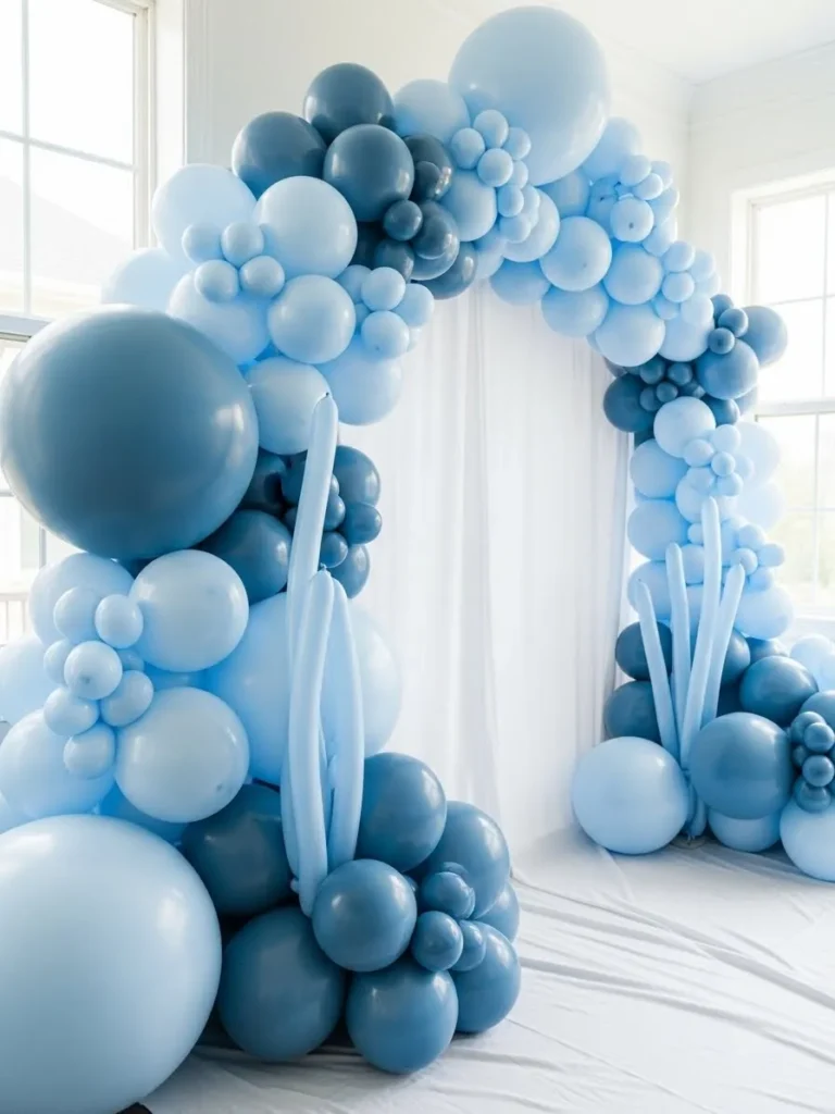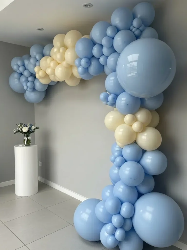 This design shows a soft balloon installation wrapping gently around the corner of the room in layered shades of baby blue and creamy ivory. The mix of oversized and smaller balloons creates a fluffy cloud effect that feels playful yet surprisingly elegant. I love how it climbs from the floor and curves overhead because it naturally frames the space and makes the room feel styled without adding extra decor. The neutral walls and clean flooring let the colors shine while keeping everything light and modern.