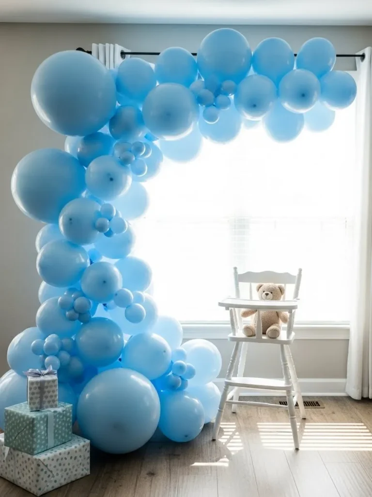 This setup features a dreamy soft blue balloon arch styled right around a bright window, creating the prettiest natural light moment for photos. The balloons are mixed in different sizes and gentle shades of blue which gives the whole backdrop that full and fluffy look without feeling overdone. I love how the arch frames the space instead of overpowering it, especially paired with the clean white curtains, light wood floors, and a simple high chair topped with the cutest teddy bear. The stacked gift boxes in coordinating blue patterns add just enough detail to make it feel styled but still cozy and homey.