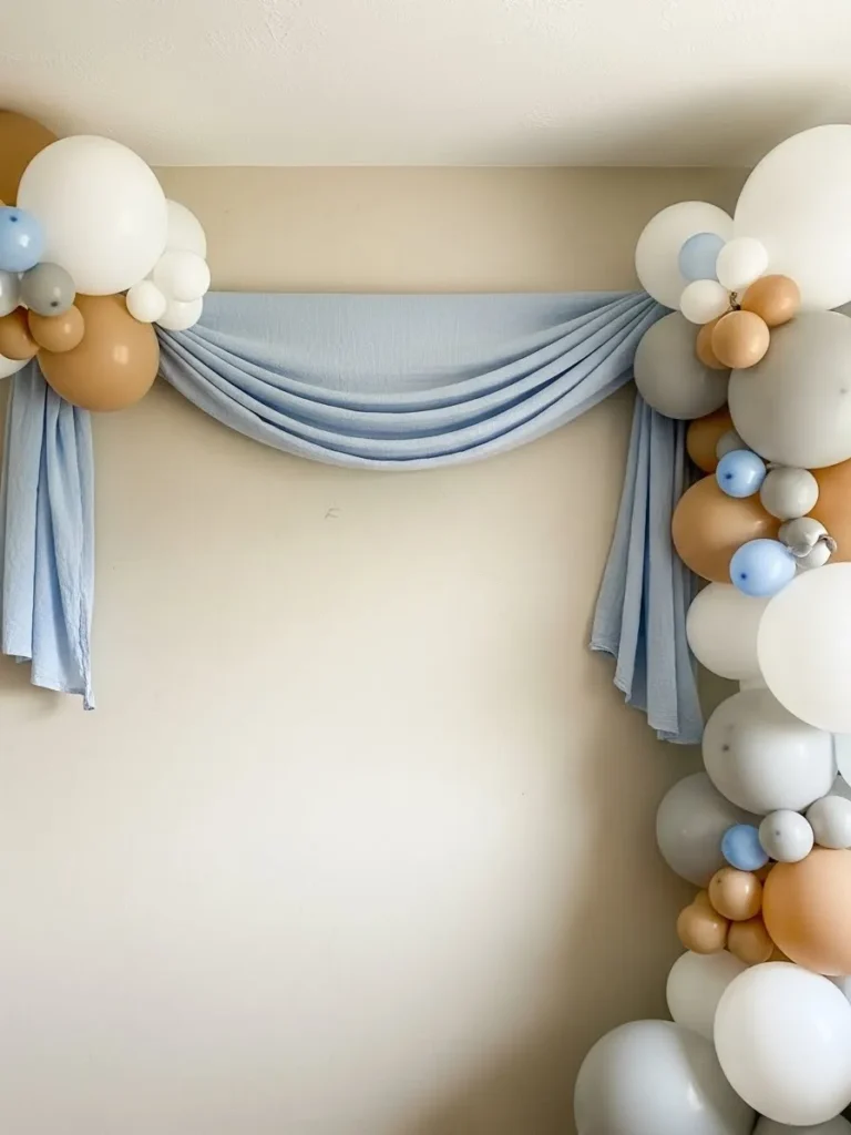 I really love this setup because it feels timeless and not overly themed. The creamy balloons warm up the cool blue background in the prettiest way and the fabric makes the whole space feel intentional and styled. If you want something that looks effortless but still very Pinterest worthy this backdrop totally delivers. It feels sweet welcoming and just right for celebrating a baby boy in a chic way.