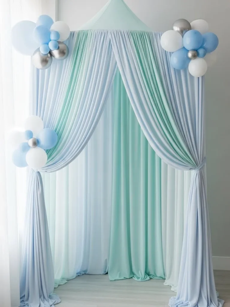 This backdrop features flowing layers of soft blue and mint fabric draped into a dreamy canopy shape that instantly feels light and airy. The fabric falls all the way to the floor for a full and elegant look, while subtle balloon clusters in pale blue white and metallic silver sit at the corners like little clouds. Everything feels balanced and gentle here, from the smooth folds of the fabric to the calm color palette that works beautifully in bright rooms or cozy indoor spaces.