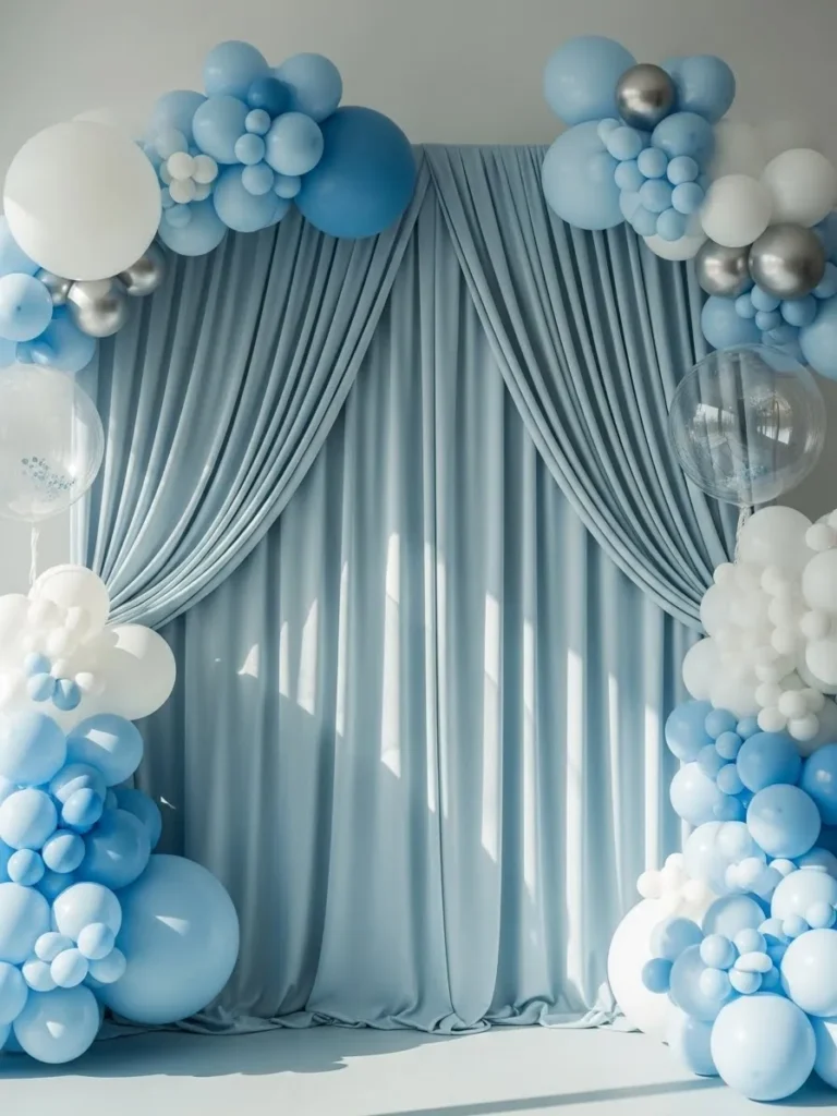 This backdrop features softly layered blue and ivory fabric panels that fall naturally to the floor, creating a relaxed and graceful base. A cluster of balloons in powder blue, white, and clear finishes sits perfectly on top, adding a playful yet polished touch. The mix of matte and transparent balloons keeps the design light and modern while the draping adds a cozy softness that photographs beautifully from every angle. It feels clean, calming, and thoughtfully styled without looking overdone.