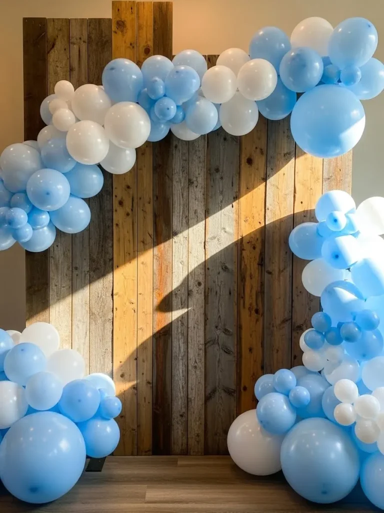 I honestly love this setup because it feels welcoming and timeless at the same time. The wood backdrop grounds the whole design so it does not feel overly sweet, and the soft blue balloons keep it playful and baby friendly. I can picture guests lining up for photos all afternoon, and every single picture would look warm, joyful, and Pinterest worthy. This is the kind of backdrop that looks amazing in real life and even better in photos, which is always the goal.