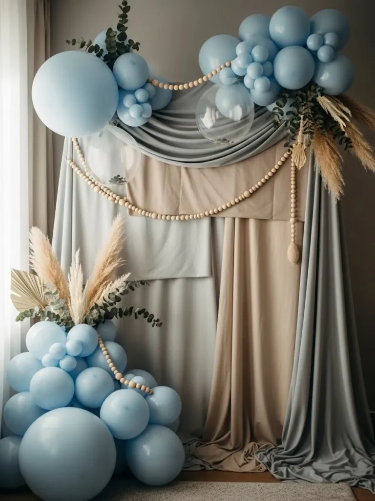 This backdrop blends soft blue balloons in mixed sizes with flowing neutral drapery for a look that feels calm and thoughtfully layered. The balloon clusters frame the top and bottom in a loose organic way while sheer fabrics in beige and pale gray add softness and movement. Natural touches like pampas grass and eucalyptus peek through the balloons and bring in a cozy boho feel. Wooden bead garlands draped across the fabric add texture and a subtle handmade charm that makes the whole setup feel warm and styled rather than overdone.