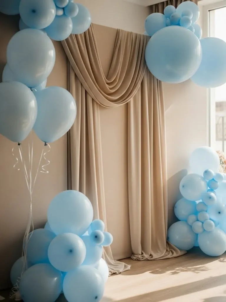 This backdrop blends soft baby blue balloon clusters with elegant neutral drapery for a look that feels airy and polished without trying too hard. The balloons are arranged in organic bunches at different heights which gives the setup a relaxed flowing feel instead of anything stiff or overly styled. The warm beige curtains add a cozy softness and help balance the cool blue tones while creating a clean vertical focal point that looks amazing in photos. Natural light hitting the setup makes everything feel bright calm and picture ready which is perfect for a boy baby shower.