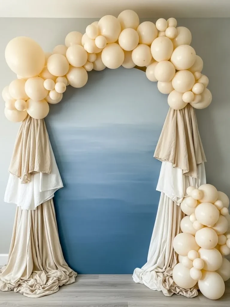 This design centers around a soft blue painted backdrop framed by an oversized balloon arrangement in warm cream tones that feels both cozy and elevated. The mix of balloon sizes creates a cloud like effect that softens the space without overwhelming it. Long flowing fabric panels in layered neutrals anchor the look and add that relaxed draped texture that works so well for indoor baby showers. The overall vibe feels calm airy and beautifully balanced which makes it a dream for photos.