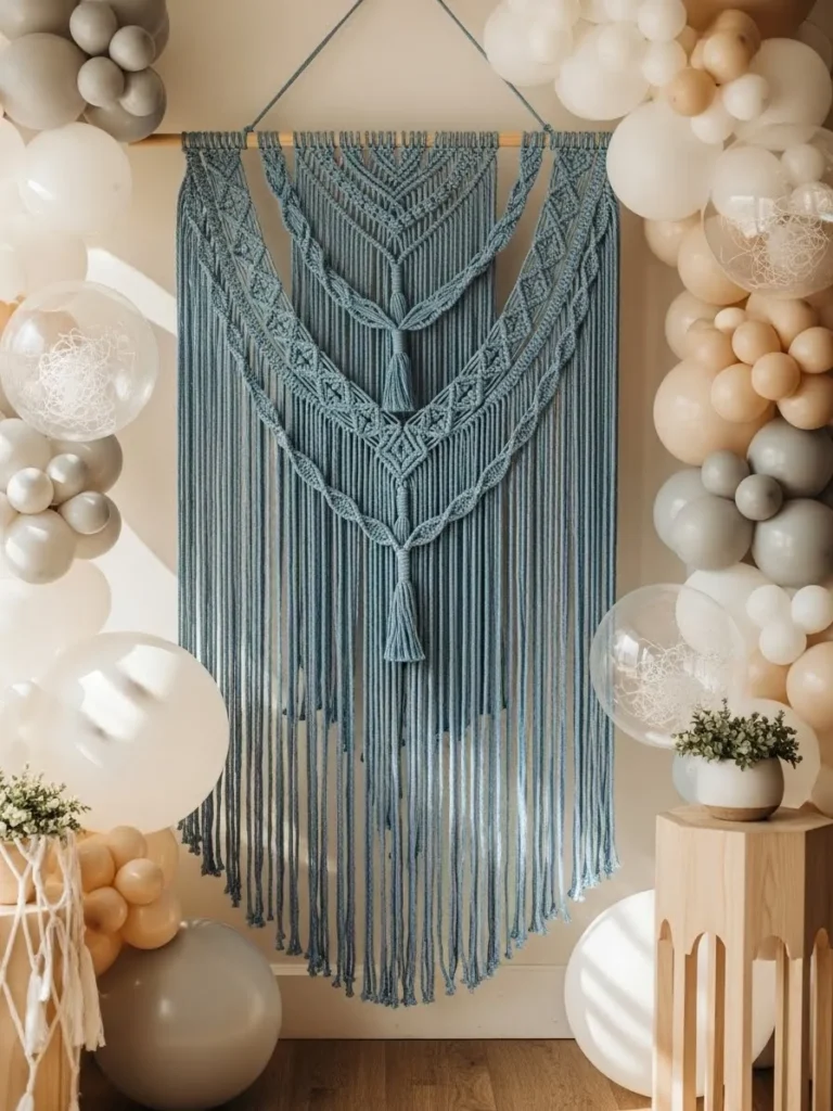 This backdrop features a dreamy soft blue macrame wall hanging as the star of the setup, layered beautifully against a warm neutral wall. The knotted texture adds depth and movement, while the long flowing strands create a relaxed boho feel that looks amazing in photos. Surrounding balloon clusters in creamy white, beige, and soft taupe keep the look light and airy without overpowering the macrame. Natural wood pedestals and subtle greenery finish the scene and give it that cozy styled corner vibe that feels intentional but still effortless.