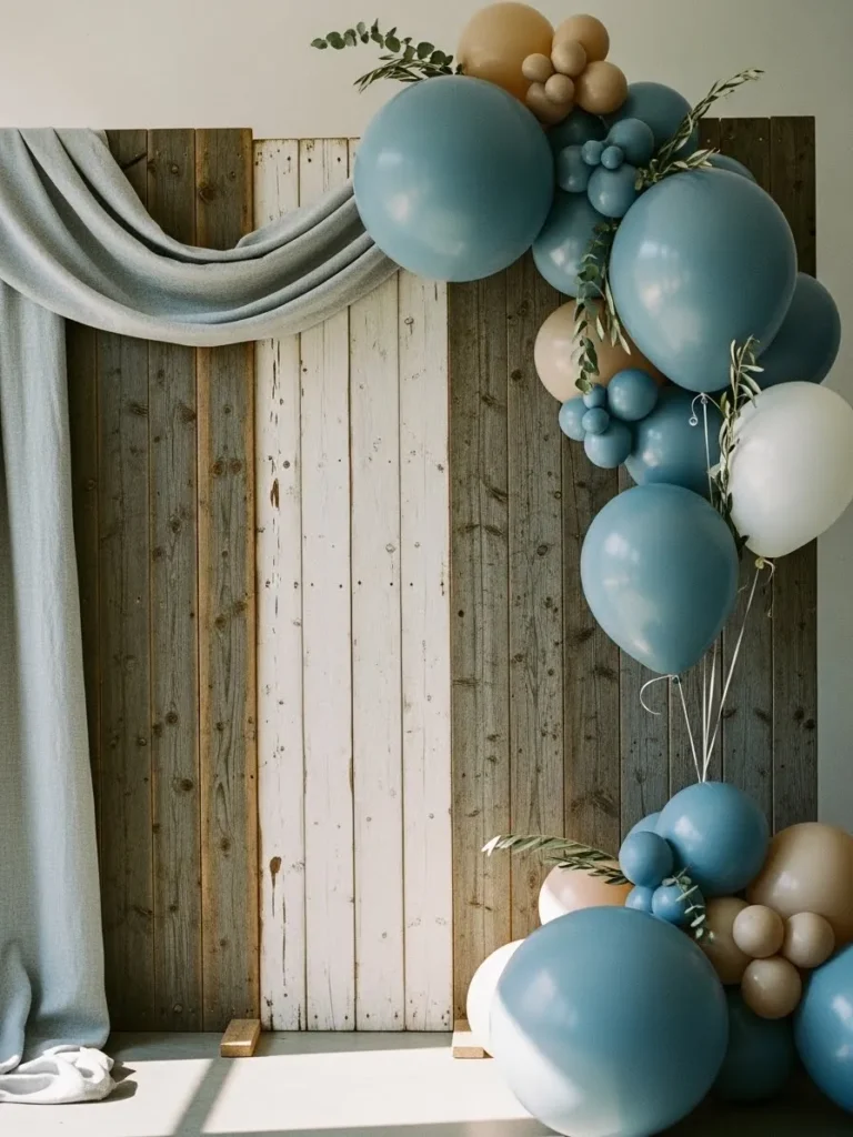 This backdrop pairs weathered wood panels with soft blue and neutral balloon clusters for a look that feels cozy yet styled. The mix of dusty blue, creamy beige, and warm white balloons adds gentle contrast without feeling loud. I love how the balloons are arranged in an organic way instead of a perfect arch which makes everything feel relaxed and natural. The light fabric drape on the side softens the wood backdrop and adds a touch of movement which looks beautiful in photos. Little greenery tucked into the balloons brings in that fresh outdoor feel that works so well for a boy baby shower.