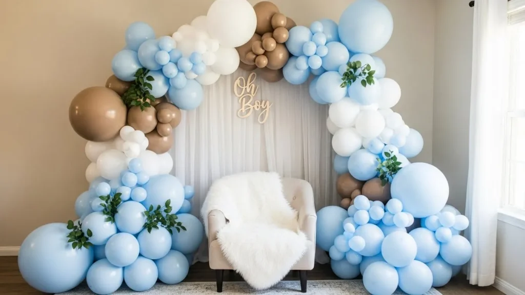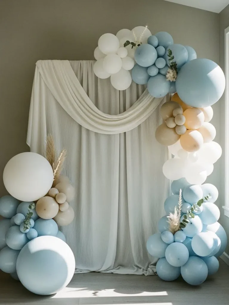 This setup feels soft and serene with its blend of powder blue cream and warm beige balloons arranged in a relaxed flowing arch. The layered balloon clusters create gentle movement while the light fabric backdrop adds an airy almost cloud like feel. Subtle greenery and dried accents peek through the balloons which keeps everything feeling natural and styled rather than stiff. The overall look is clean calming and perfectly suited for sweet baby shower photos that feel timeless instead of trendy.