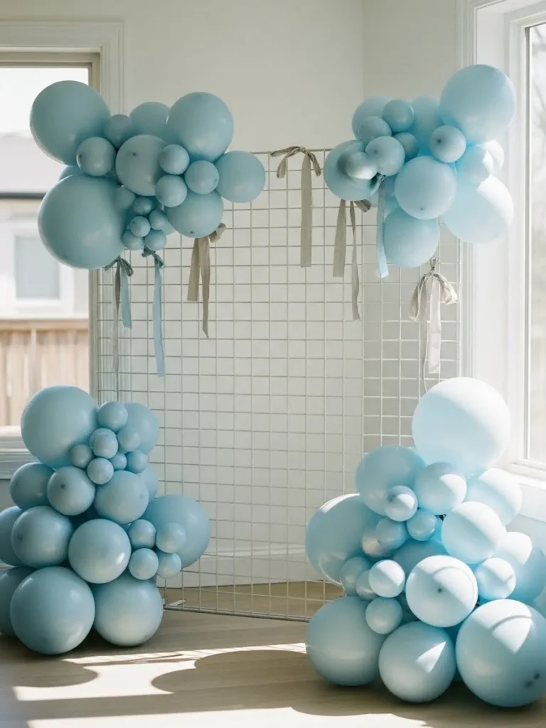 This backdrop features airy clusters of soft blue balloons arranged around a simple white grid frame, creating a look that feels modern, light, and perfectly balanced. The mix of balloon sizes adds gentle texture without feeling overwhelming, while the pale blue tones keep everything calm and baby sweet. Neutral ribbons tied at the sides soften the structure and give it a styled but still relaxed vibe. Placed near natural light, this setup feels fresh and open, which makes it ideal for bright daytime photos that still feel polished.