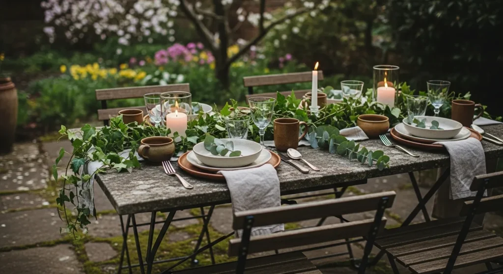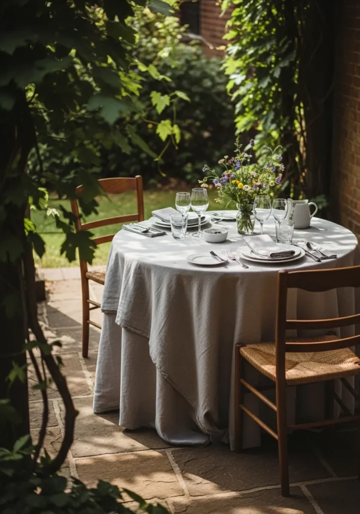 This outdoor setup features a small round table dressed in a crisp white tablecloth, simple tableware, and soft florals, all nestled into a leafy garden corner. The surrounding greenery creates natural privacy, while the stone ground and wooden chairs keep the look grounded and relaxed. It feels intimate and thoughtfully arranged, like a quiet spot meant for meaningful conversation.