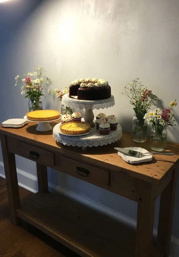 This wooden console table is styled with a cake stand, small floral arrangements, and simple serving pieces. The background stays clean and minimal, letting the desserts and decor take center stage. The mix of wood textures and soft colors gives the setup a cozy and welcoming feel.