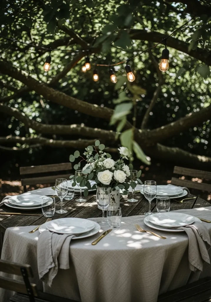 This round table sits beneath a wide tree canopy, dressed in soft linens and classic tableware. String lights are woven gently through the branches above, adding a warm glow as the light fades. The surrounding greenery creates a sense of privacy and calm.