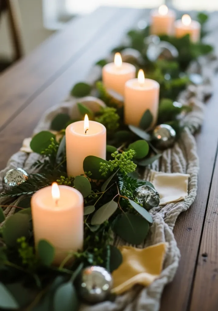 A long table is styled with candles nestled into lush greenery running down the center. The warm candlelight reflects softly off glass and wood, creating depth and warmth without overwhelming the space. Everything feels balanced and intentional.