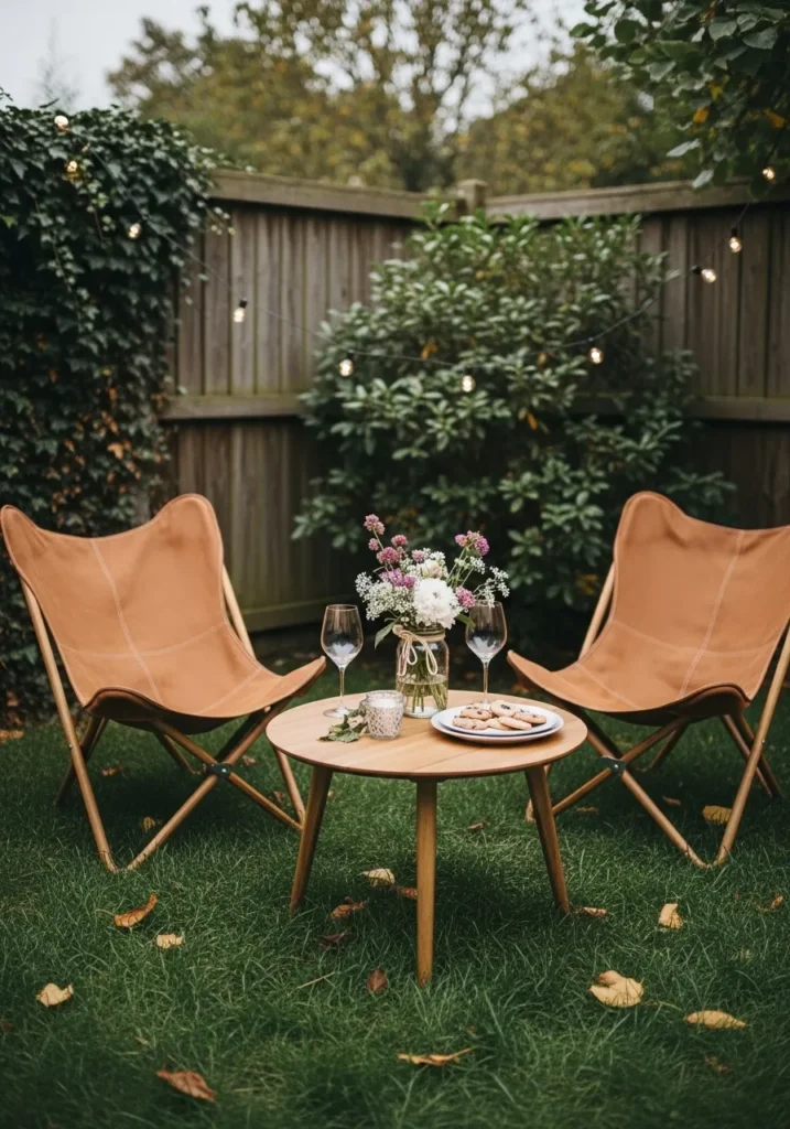 This outdoor seating area features two comfortable chairs and a small round table placed on a patch of grass. A simple floral arrangement adds softness, while the fence and greenery in the background keep the space feeling private and relaxed.