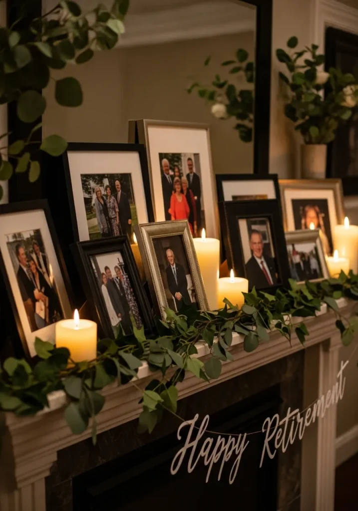 A mantel or console is styled with framed photos, greenery, and glowing candles. The arrangement feels layered and personal, with each photo adding character and story to the space. The warm light pulls everything together beautifully.