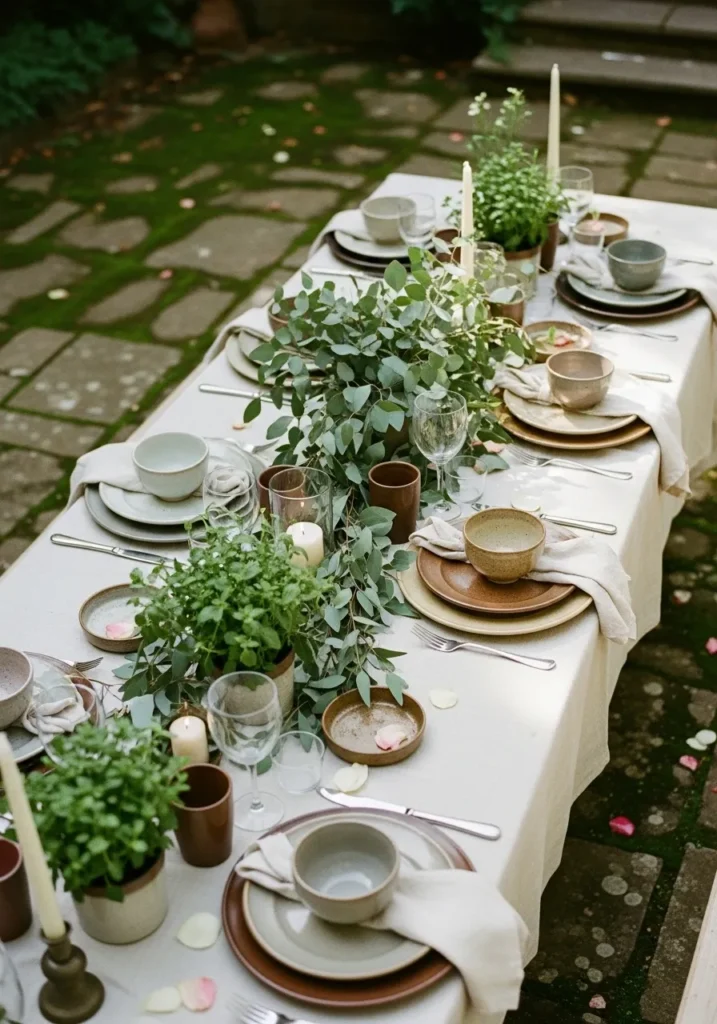 A long table is set outdoors with neutral linens, stoneware plates, and greenery woven throughout the center. The stone path beneath adds texture, and the overall layout feels relaxed yet polished. It looks ready for a shared meal that lingers.