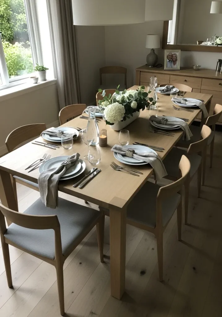 This indoor dining table is styled with simple tableware, greenery, and natural wood tones. Light streams in from nearby windows, highlighting the clean lines and calm color palette. The room feels peaceful and welcoming.