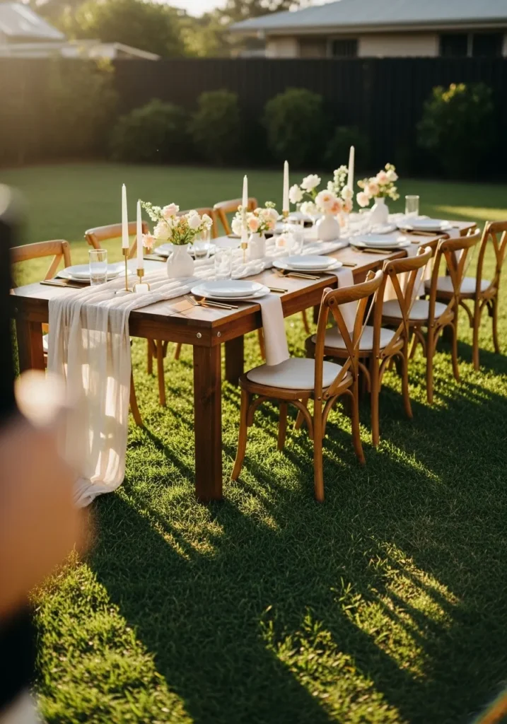 Sunlit Lawn Dinner with Natural Wood Details