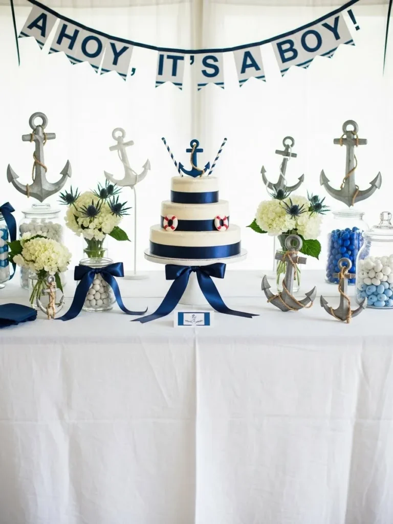 I love this kind of display because it instantly sets the tone the moment guests walk in. It feels sweet and thoughtful but still polished, which is not always easy to pull off with baby shower decor. I am especially drawn to how the anchors add personality without overpowering the space, and the navy accents make everything feel calm and elevated. This is one of those designs that photographs beautifully and still feels warm and welcoming in real life.